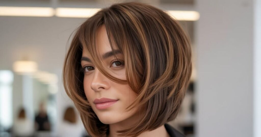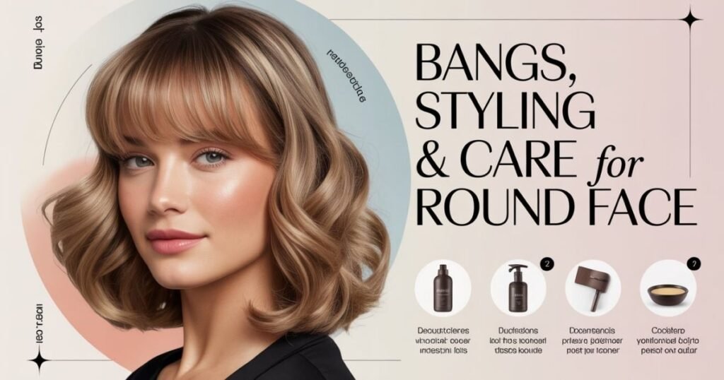 Bangs for round face women are best when side-swept, curtain, or layered. Avoid blunt bangs that make cheeks appear wider. Styles with volume at the crown, face-framing layers, and long fringe or side fringe create the illusion of length. Daily hair styling routine and salon maintenance and trims maintain the cut’s shape and elegance.